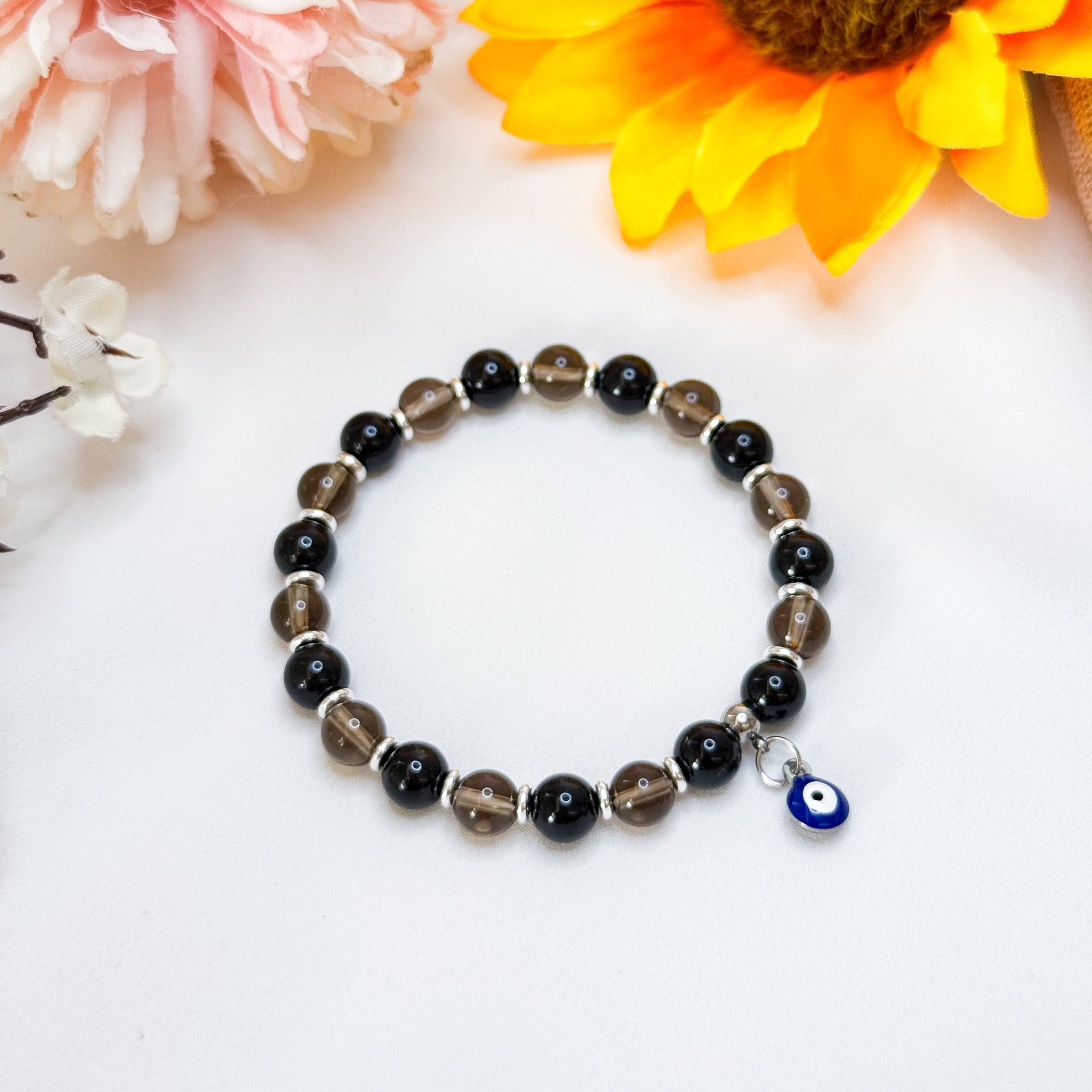 Smoky Quartz (6mm), Black Tourmaline (6mm), 304 Stainless Steel Evil Eye