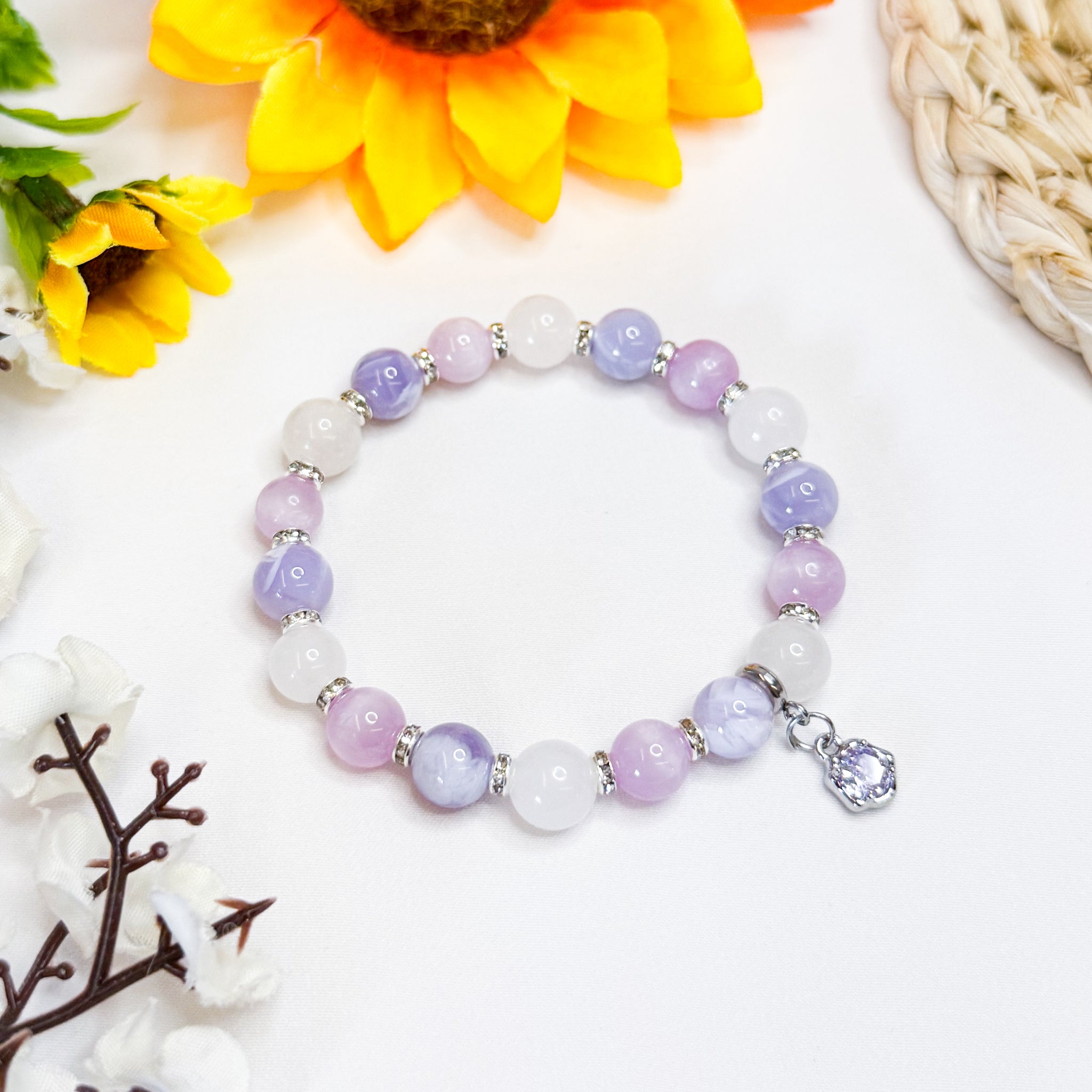 Lavender Milky Amethyst (8mm), White Jade (8mm), Kunzite (7mm)
